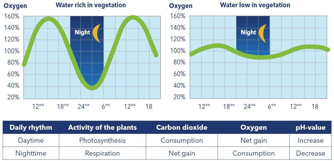In plant-rich watercourses, the oxygen content is influenced by the day-night rhythm. In summer periods, water bodies with strong plant or algae growth are often supersaturated with oxygen during daytime. This is a result of the photosynthesis of the plants and algae - they produce oxygen throughout the day in such quantities that the oxygen content of the water increases significantly. When it gets dark, photosynthesis stops, and during the dark hours, the plants consume oxygen. The oxygen level is often at its lowest shortly before the break of day.