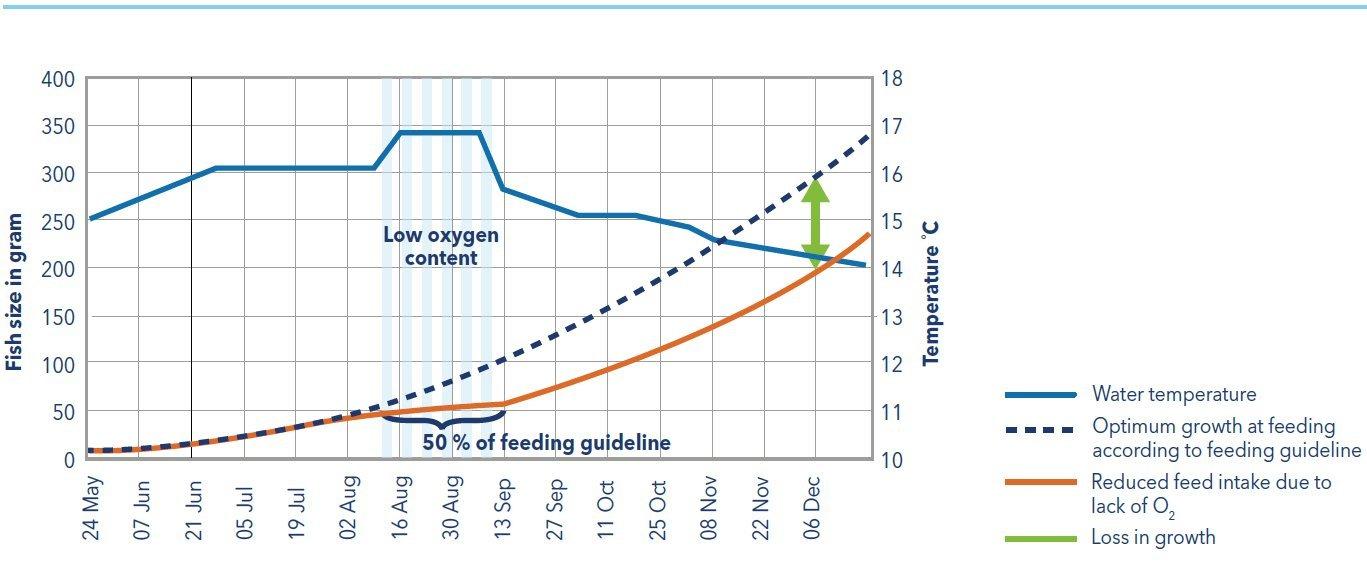 The growth of the fish is influenced by the oxygen content of the water. Comparing the optimum growth to the reduced growth, the loss in growth caused by a lack of oxygen becomes obvious. If there is a lack of oxygen, the fish eat less. It was demonstrated that the feed intake can fall to a level below 50 % in the feeding guide.