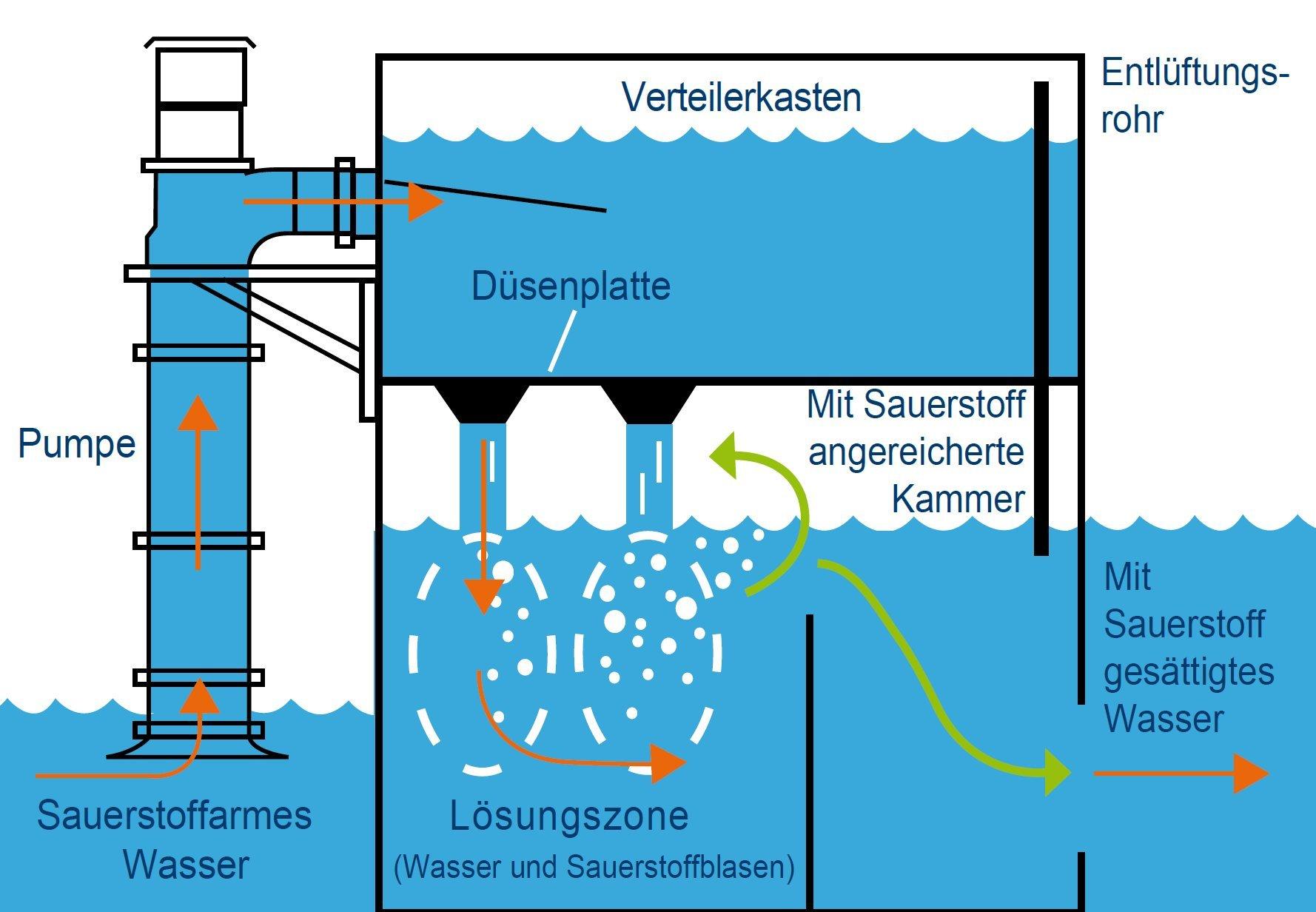 Das Wasser strömt aus einer Verteilerkammer durch eine horizontale Platte mit speziell entwickelten Düsen, wodurch Wasserstrahlen entstehen. Die Strahlen gelangen in eine Kammer, die mit flüssigem Sauerstoff angereichert ist. Die Düsen treffen ca. 20 cm unterhalb der Platte auf die Oberfläche der Wasseroberfläche. Die Düsen blasen Sauerstoffblasen ins Wasser, wodurch ein "Nebel aus Blasen" entsteht. Dadurch wird sichergestellt, dass sich der Sauerstoff gut mit dem Wasser vermischt und sich hier, in der Auflösungszone, der Sauerstoff im Wasser auflöst. Sauerstoffblasen, die in der Sauerstoffkammer an die Oberfläche steigen, werden mit den Wasserstrahlen wieder nach unten gesaugt und so "wiederverwendet".
