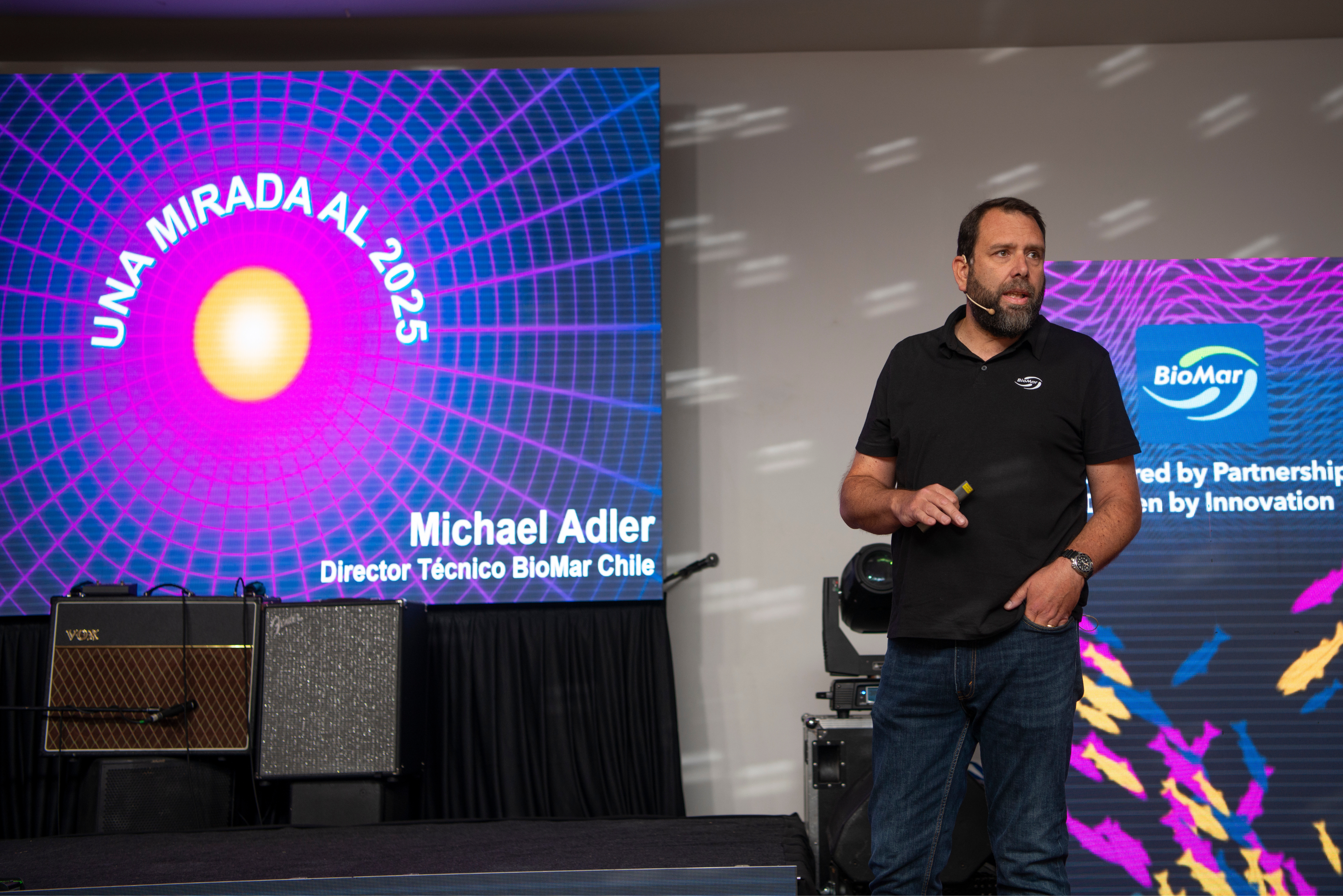 A continuación, Michael Adler, Director Técnico de BioMar Chile, presentó un análisis de los resultados productivos del 2025 y explicó el nuevo indicador que se utilizará para premiar la productividad y eficiencia de los centros alimentados por la compañía.