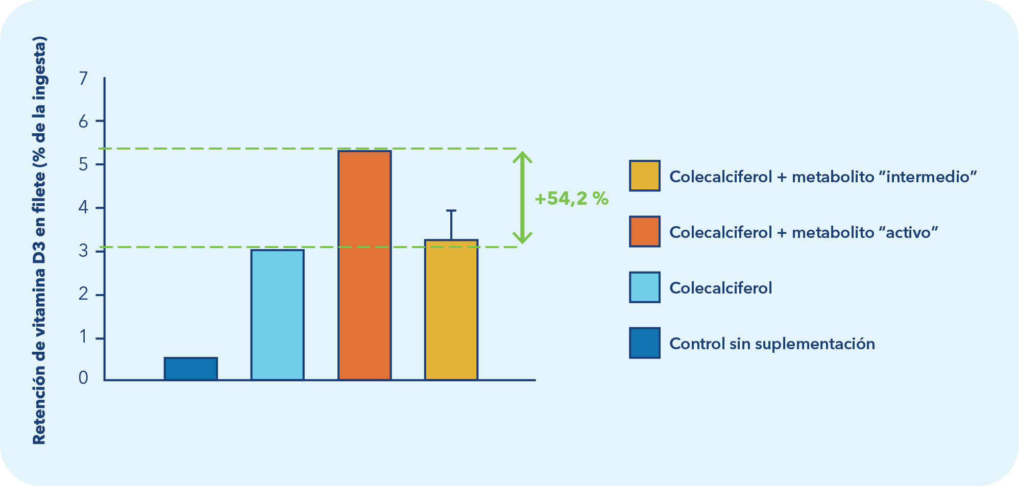 No se observaron diferencias significativas en la tasa de crecimiento, la ingesta de alimento ni el índice de conversión entre los tratamientos. Los peces alimentados con vitamina D3 sintética y con combinaciones con sus metabolitos crecieron igualmente bien, lo que confirma que tanto la suplementación a niveles elevados como el uso de metabolitos son seguros en condiciones comerciales de RAS.