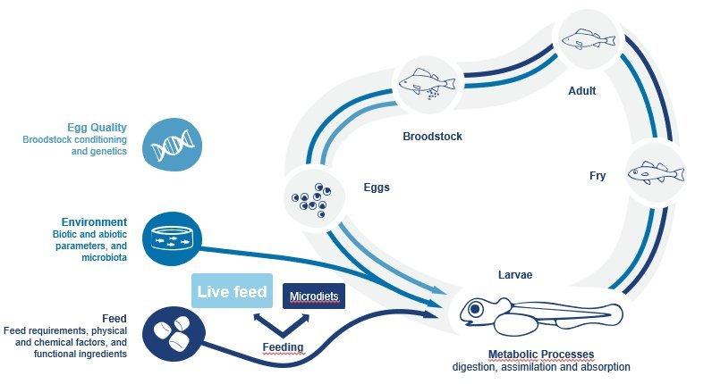 Dans l'élevage larvaire de poissons marins, les premières étapes sont cruciales pour déterminer la santé, la qualité, la robustesse et les performances des juvéniles pendant la croissance. Cette période initiale est influencée par une interaction complexe de facteurs, y compris la qualité des œufs, les conditions environnementales, l'alimentation et la nutrition.