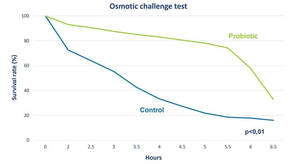 Shrimp fed the probiotic diet exhibited enhanced tolerance to osmotic stress, with significantly lower mortality rates compared to the control groupduring the osmotic shock test (p<0.01) (Figure 1). This suggests a better capacity of shrimp fed with probiotics to cope with environmental stressors.