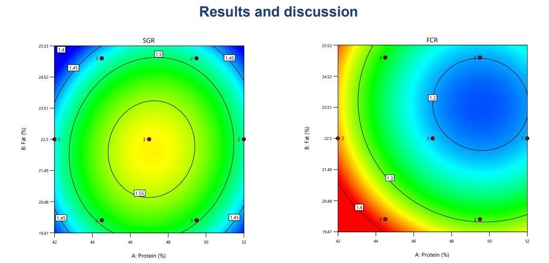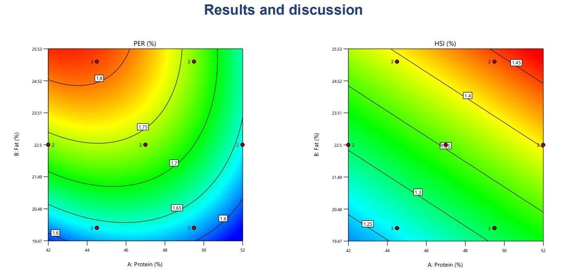 The protein efficiency ratio (PER) was significantly influenced by both crude protein (p<0.007) and crude lipid levels (p<0.0001). PER decreased with higher protein and lower lipid levels in the diet, highlighting the importance of balancing these nutrients for optimal feed efficiency.