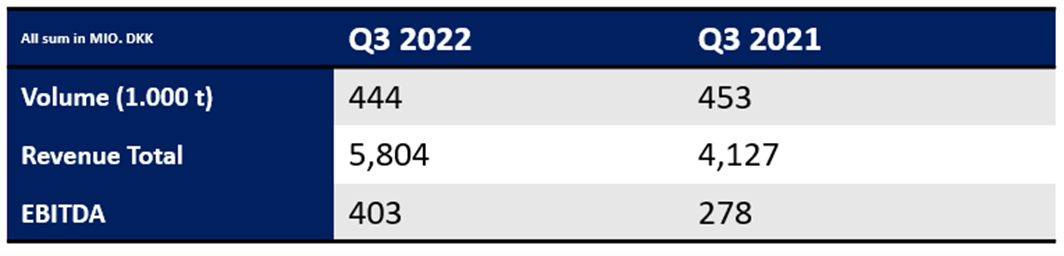 Driven by a solid sale in the feed business combined strong results in the newly acquired AQ1, BioMar earnings went up by 45% compared to Q3 2021. The significant increase in revenue was mainly driven by higher market prices on raw material and to some extend currency development. Revenue for the year to date amounted to DKK 12,887 million, compared with DKK 9,256 million in the same period 2021.