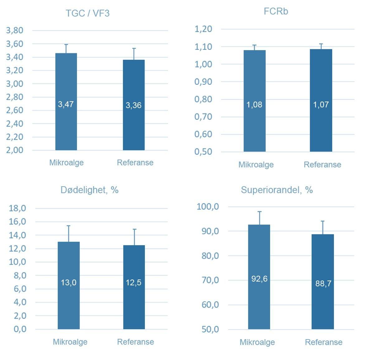 Forsøket gikk etter planen og resultatene viste at verken appetitt eller fôrutnyttelse ble negativt påvirket av at fiskeoljen var byttet ut med mikroalger. Gjennomsnittlig slaktevekt ved endt forsøk var 5,4 kg. Oppnådd vekstfaktor (VF3/TGC) i gruppen som hadde fått mikroalger var 3,47 med en biologisk fôrfaktor på 1,08 ferdig utslaktet (Figur 1). Det var ingen signifikante forskjeller i tilvekst og fôrfaktor mellom gruppene og heller ingen signifikante forskjeller i avgang/dødelighet i forsøksperioden. Årsakene til dødelighet var sammensatte, men var i hovedsak knyttet til vintersår, behandling og tap etter utsett. Pigmentinnholdet ved slakt endte på 7,9 mg/kg og superiorandelen var 92,6 % i gruppen som hadde som hadde fått mikroalger. Vi hadde ikke mulighet til å kvantifisere melaninfrekvens på slakteriet, men det ble registrert ved en industritest. Selv om utvalget var noe begrenset var det numerisk lavere melaninfrekvens i gruppen som hadde fått mikroalger. God pigmentering og positiv melanineffekt samstemmer godt med tidligere forsøk med DHA rike fôr (Mørkøre et al., 2022).