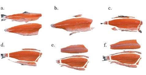 Fisken ble bedøvet og avlivet med slag mot hodet. Den ble så veid og målt (gaffelengde) før den ble bløgget ved å kutte gjellebuene på begge sider. Fisken fikk deretter blø ut i 15 minutter i kar med rennende sjøvann. Etter utblødning ble fisken tørket og veid igjen for å fastsette blodtap. Den ble så sløyd (innvoller og blodrand) slik at både sløydvekt og slaktevekt kunne registreres. Ved å ta utgangspunkt i Bjørkli (2002) sin metodikk kunne vi effektivt skille de ulike komponentene; fiskekjøtt, blod, skinn og hode, finner og bein, og dermed bestemme spiselig andel (figur 2). Hver bestanddel ble deretter veid individuelt for å beregne de ulike delene av fisken som kan klassifiseres som spiselig eller anvendbart på annen måte (tabell 1, figur 3).