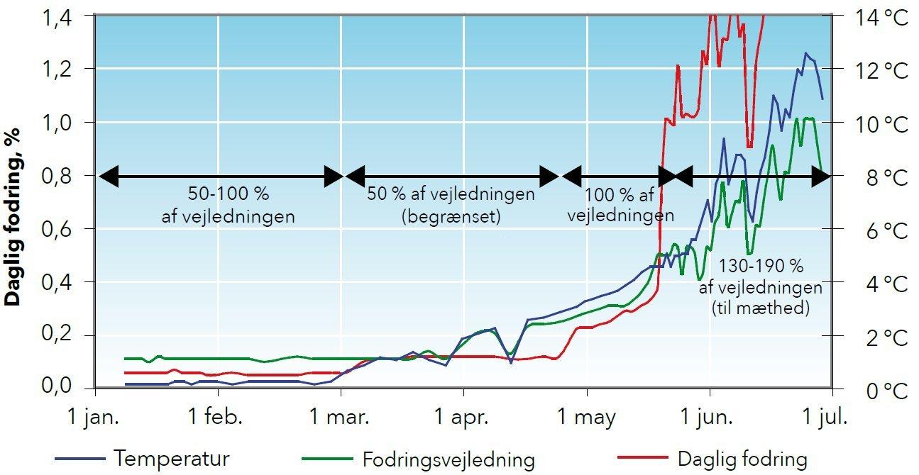 Efter en kold vinter med lave temperaturer kan forårets komme være forbundet med hastige temperaturstigninger. Denne tid kan være en udfordrende og risikabel tid for fiskene, hvis fodringsstrategien ikke tilpasses omstændighederne.