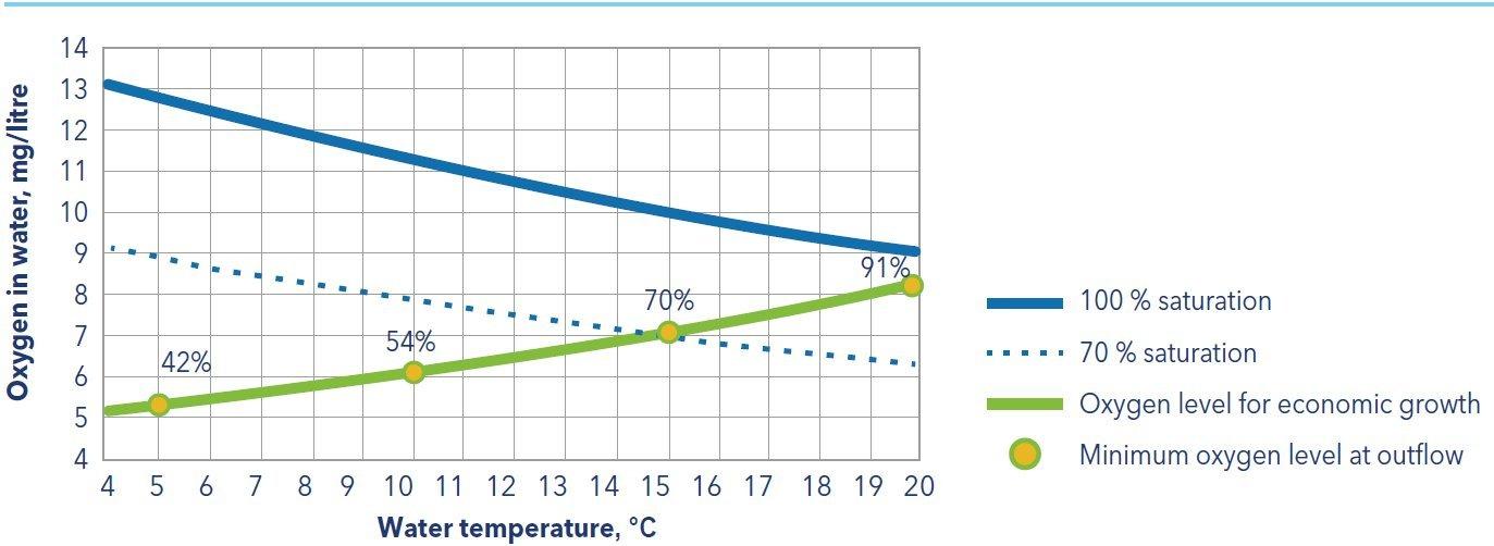 100 % oxygen saturation means that the water contains approx. 14 mg of oxygen per litre at 2 °C and only approx. 9 mg at 20 °C. In practice, the saturation level at the inlet is often different, especially if the farm is run on surface water, for instance due to high summer temperatures or to rich vegetation.