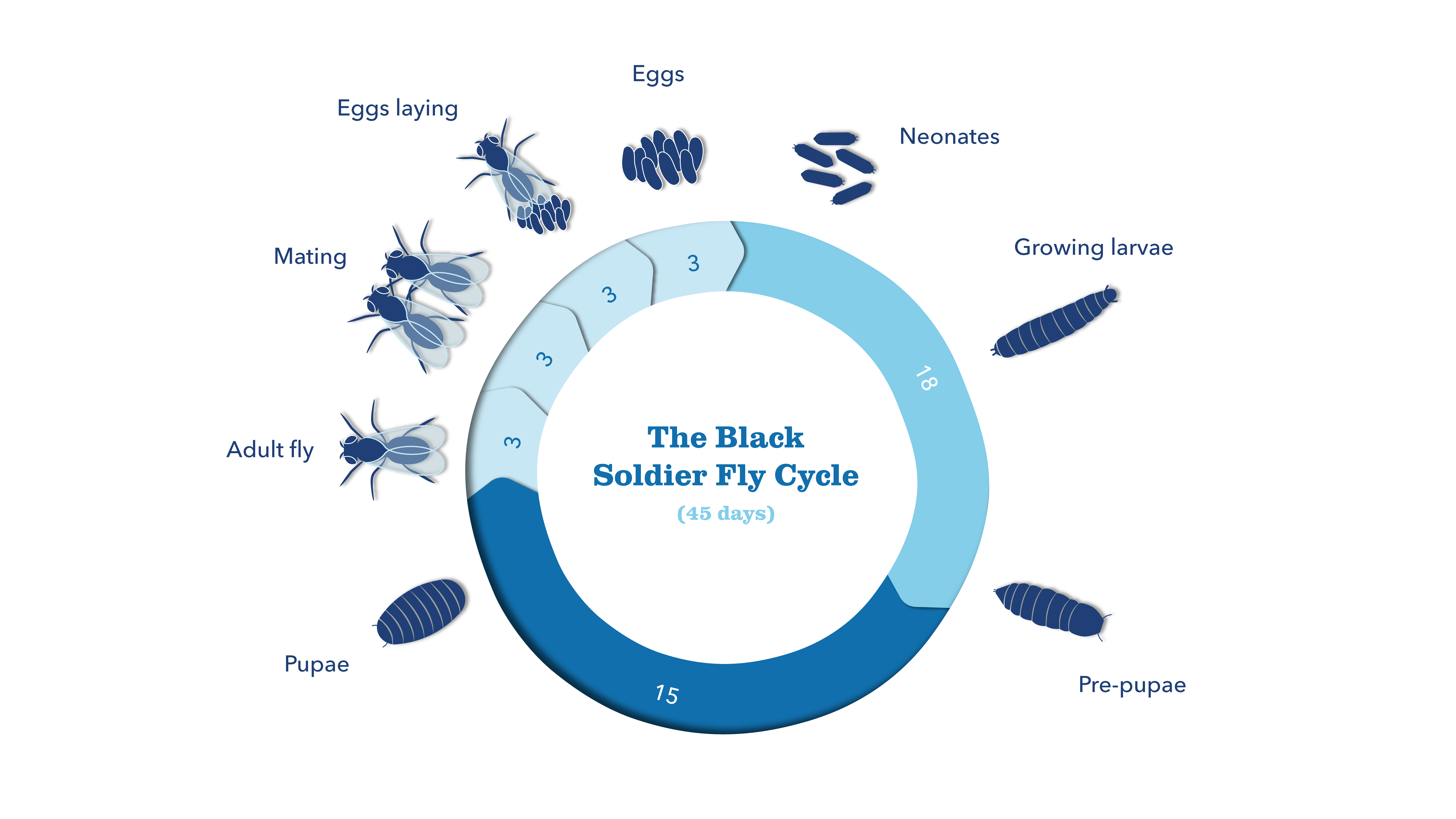 The BSF's life cycle is characterized by high yields and a short reproduction cycle. It takes only four weeks for BSF to grow from egg to adult fly. Agronutris’ optimized rearing conditions enable larvae to multiply their weight by 10,000 within two weeks. The larvae are then collected and transformed into valuable ingredients for animal feed.