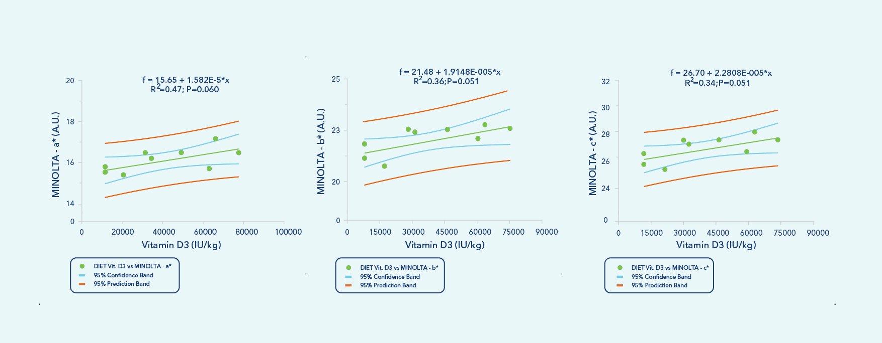 Figure 2. Regression analyses of dietary vitamin D3 (IU/kg) levels and MINOLTA parameters (A.U.) measured in the fillets from fish fed the experimental diets for 61 days. Dots represent the mean of the experimental treatments (n=2 in D1 and n=1 in the rest).