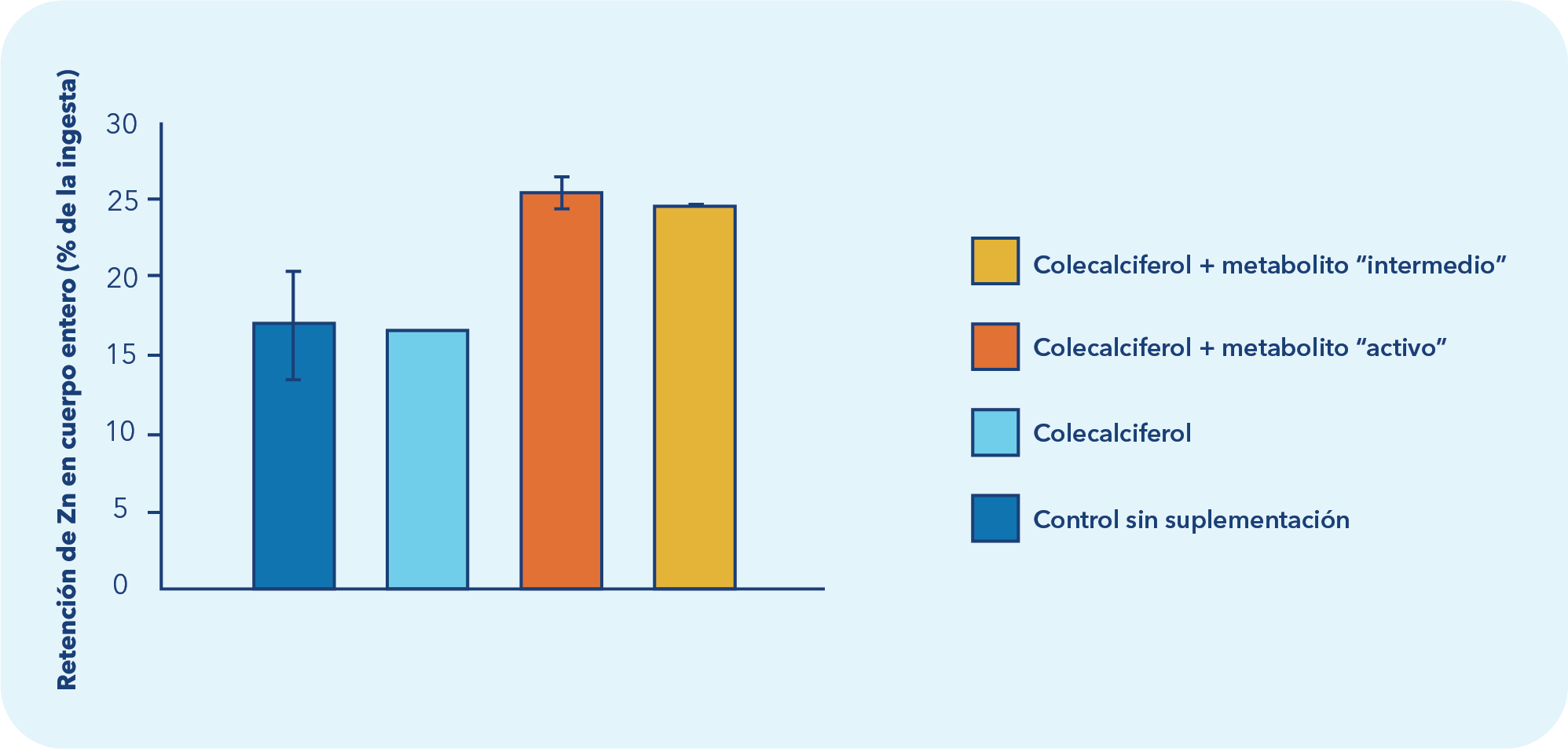 La suplementación con metabolitos de vitamina D3 también influyó en la absorción de minerales. Los peces alimentados con combinaciones de colecalciferol y el metabolito en forma "intermedia" o "activa" mostraron una mayor retención de zinc y hierro en el cuerpo entero en comparación con aquellos que recibieron solo vitamina D3 sintética. Se observó una leve correlación negativa entre los niveles dietéticos de zinc y la retención de vitamina D3 en el filete (expresada como porcentaje de la ingesta), lo que sugiere una posible interacción entre la disponibilidad de zinc y la utilización de la vitamina D3.