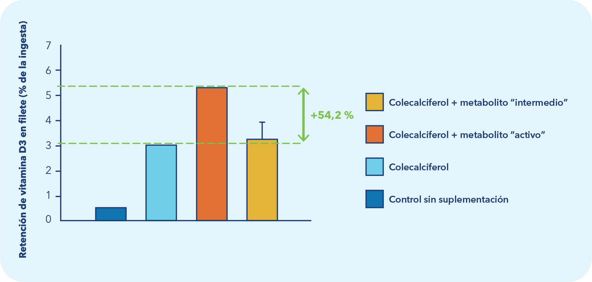 No se observaron diferencias significativas en la tasa de crecimiento, la ingesta de alimento ni el índice de conversión entre los tratamientos. Los peces alimentados con vitamina D3 sintética y con combinaciones con sus metabolitos crecieron igualmente bien, lo que confirma que tanto la suplementación a niveles elevados como el uso de metabolitos son seguros en condiciones comerciales de RAS.