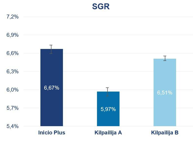 Kalan kasvua mitataan yleisesti Specific Growth Rate (SGR) avulla, joka ilmaisee yksittäisen kalan päivittäisen kasvun prosentteina. SGR on vesiviljelyssä keskeinen suorituskykyindikaattori, sillä kasvunopeus linkittyy vahvasti tuotannon tehokkuuteen ja kannattavuuteen. Kaupallisessa kalankasvatuksessa kalan maksimaalisen kasvun saavuttaminen on usein yksi tärkeimmistä tavoitteista, erityisesti kun energia- ja rehukustannukset muodostavat suuren osan kaikista tuotantokustannuksista. Tehdyssä kokeessa Inicio Plus -alkukasvatusrehulla ruokitut kalanpoikaset saavuttivat huomattavasti korkeamman SGR-arvon muilla kaupallisilla alkukasvatusrehuilla ruokittuihin kalanpoikasiin verrattuna.
