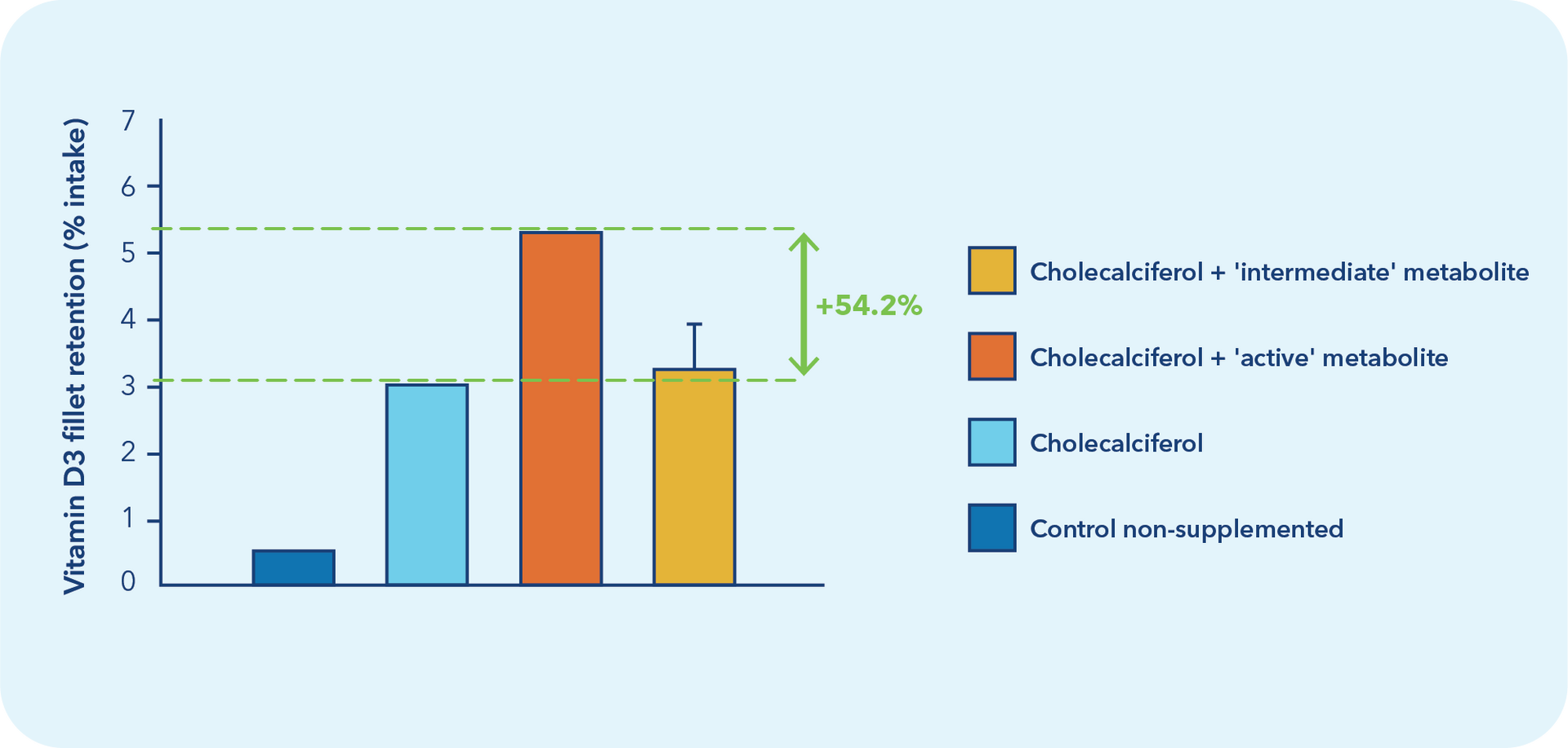 No significant differences were observed in growth rate, feed intake, or feed conversion ratio across all treatments. Fish fed both synthetic vitamin D3 and combinations with its metabolite forms grew equally well, confirming that high-level supplementation and metabolite use are safe under commercial RAS conditions.