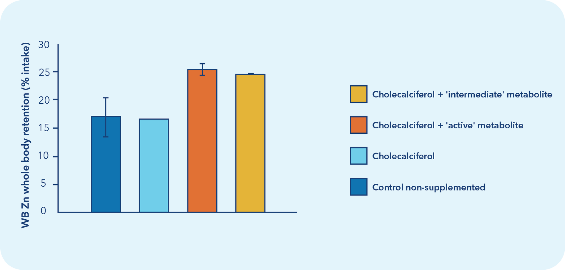 Supplementation with vitamin D3 metabolites also influenced mineral uptake. Fish fed combinations of cholecalciferol with either the ‘intermediate’ or ‘active’ metabolite showed improved whole-body retention of zinc and iron compared to those fed synthetic D3 alone. A mild negative correlation was observed between dietary zinc levels and fillet vitamin D3 retention, expressed as a percentage of intake, suggesting a potential interaction between zinc availability and vitamin D3 utilization.