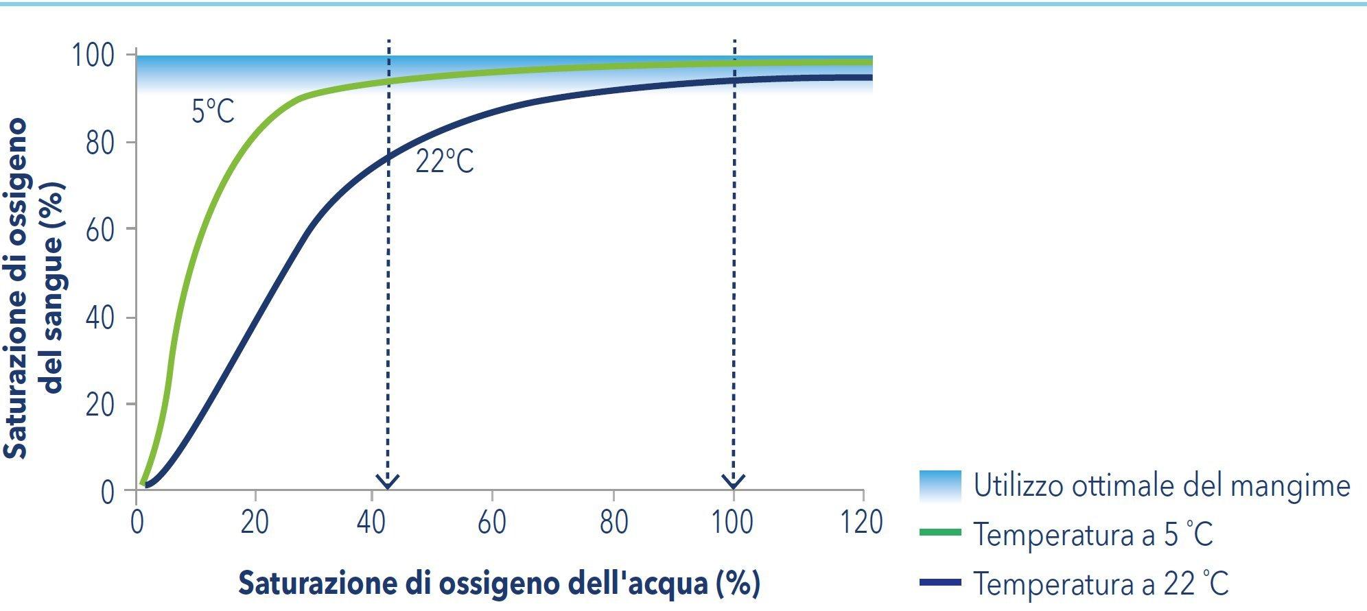 Il contenuto di ossigeno nell'acqua influisce sul contenuto di ossigeno nel sangue dei pesci, in funzione della temperatura, e ciò può avere un'influenza sull' utilizzo ottimale del mangime. Se i livelli di saturazione di ossigeno sono insoddisfacenti, l'utilizzo del mangime diminuisce e, di conseguenza, l’Indice di Conversione del mangime aumenta. Per un’utilizzazione ottimale dell'alimento, è necessario che il sangue, quando esce dalle branchie, sia saturato quasi al 100 % di ossigeno.