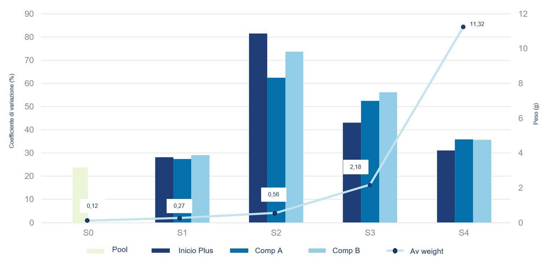 Questa uniformità rappresenta un chiaro indicatore di prestazioni alimentari costanti, dimostrando che il mangime sostiene una crescita equilibrata tra gli individui e riduce le differenze all’interno del gruppo.