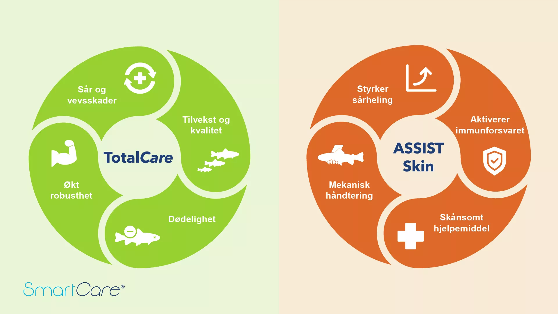 I vårt arbeid med helsefôr, benytter BioMar klinisk ernæring for å utvikle fôr som skal støtte fisken gjennom utfordrende perioder og gjøre den mer robust. Gjennom mange år med forskning har vi utviklet fôrene Total Care og Assist Skin som utgjør vår anbefalte vinterfôrstrategi (figur 1). Total Care er et helhetlig fôr for å bygge opp og støtte robusthet, skinnhelse, hjertehelse og immunforsvar. Dette fôret anbefales i lengre fôringsperioder for å bygge opp fiskens robusthet over tid. Se på det litt som å ta tran hver dag for å motvirke betennelse og forebygge sykdom. Assist Skin anbefales som et tilleggsfôr i kortere pulser. Fôret er utviklet for å styrke hudbarrierer og sårhelingsprosessen ved å støtte en effektiv immunrespons. Gjennom vinterperioden har fisken behov for ekstra støtte med tanke på skinnhelse og sårheling.