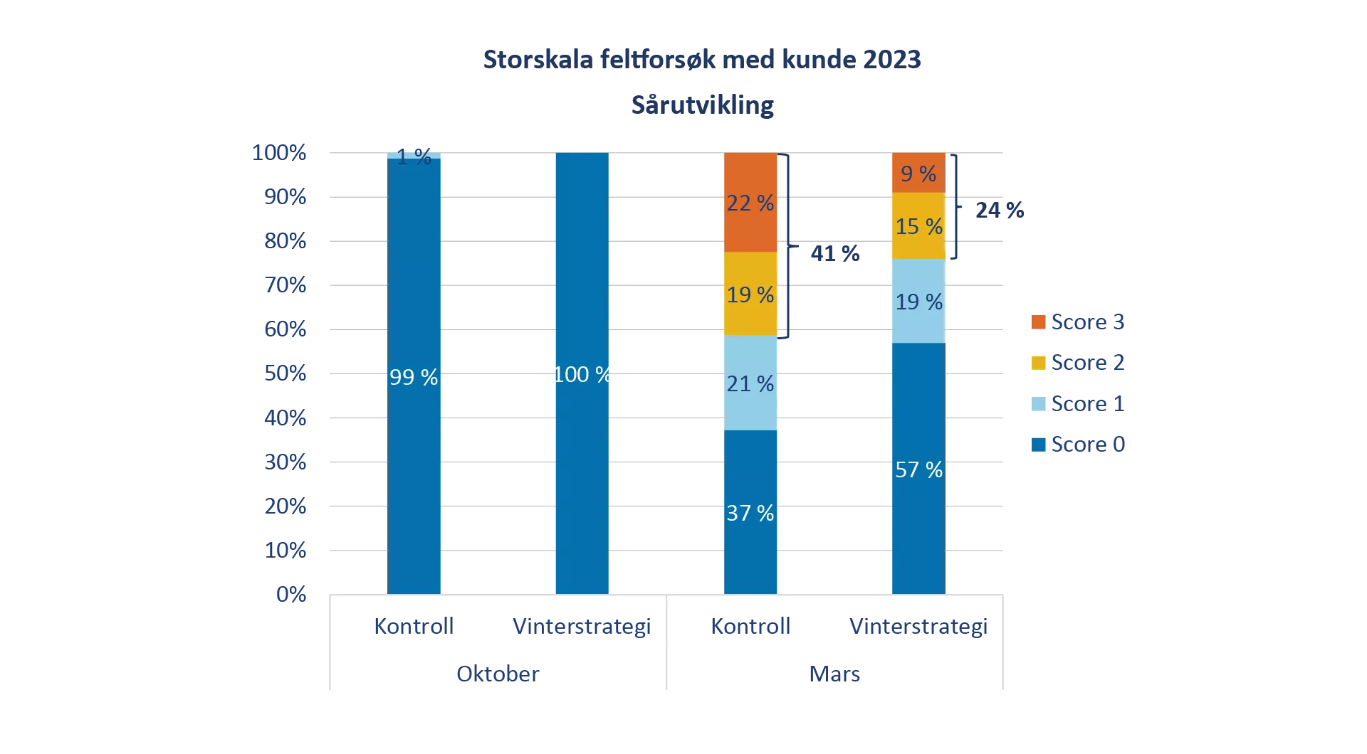 I forsøket ble det gjennomført velferdsscoringer med en gradering fra 0-3. Resultater viste tydelige forskjeller på andelen fisk med alvorlige sår (score 2 og 3) mellom kontrollgruppen og vinterfôrstrategigruppen (figur 2). Alvorligheten av disse sårene gjenspeilet seg også i dødeligheten, som var på henholdsvis 9,7% for kontrollgruppen og 4,9% for gruppen med vinterfôrstrategi. Dødelighetsårsakene i denne perioden var i hovedsak sår og skader i forbindelse med håndtering og behandling, samt vintersår.